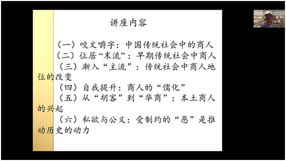 师生带来了题为“从‘末流’到‘主流’——中国商人的成长史” 的精彩讲座。本次会议通过腾讯会议在线举行,由辣文
