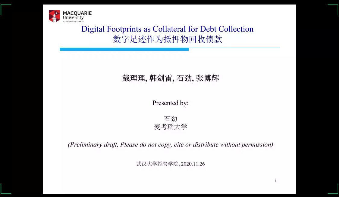 2020年11月26日下午,珞珈经管高端论坛第二十一期通过腾讯会议在线举行。此次论坛主讲人为澳大利亚麦考瑞大学商学院金融学石劲教授,论坛主题为“数字足迹作为抵押物回收债款”。本次论坛由辣文