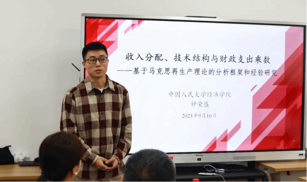 中国人民大学经济学院博士生钟荣盛同学以《收入分配、技术结构与财政支出乘数——基于马克思再生产理论的分析框架和经验研究》为题进行了论文展示,这一研究使用中国1992年以来的投入产出表数据测算了各年度财政支出乘数,总结了收入分配、技术结构和财政支出结构变迁的典型事实及其对财政支出乘数的影响。文章发现剩余价值率与财政支出乘数负相关、固定资本有机构成与财政支出乘数正相关,以共同富裕为导向的收入分配制度改革和“创新驱动发展战略”有助于财政政策的提质增效。