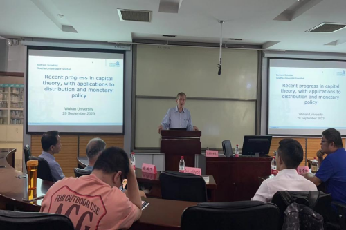 2023年9月28日下午,珞珈经管发展论坛第八十三期——“资本理论前沿:理论进展、分配效应和货币政策”(Recent Progress in Capital Theory, with Applications to Distribution and Monetary Policy)在学院A221会议室如期举办。本次论坛邀请法兰克福歌德讲席教授波特伦·谢弗德(Bertram Schefold)担任主讲人,海德堡大学马克思韦伯社会学研究所研究员姜宏博士担任翻译,学院颜鹏飞教授担任与谈人,经济学系主任李雪松教授主持论坛。王今朝、刁莉、傅十和、彭凯翔、何石军等教师,马克思主义学院、政治与公共管理学院部分青年教师,相关学院研究生参加会议。