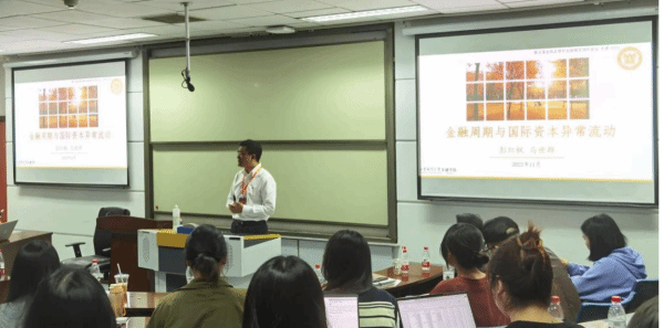 金融系余静文老师主持,李斌、罗琦、胡利琴、李艳丽、沈思晨等金融系老师和四十余名学生参加讲座。