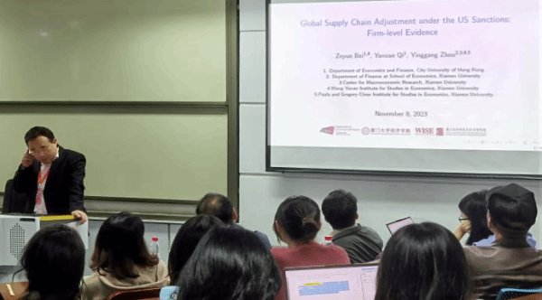 讲座首先由厦门大学的周颖刚教授带来主题为“美国制裁下的全球供应链调整:企业层面的证据(Global Supply Chain Adjustment under the US Sanctions: Firm-level Evidence)”的学术报告。周颖刚教授的研究考察了美国制裁对全球供应链重组的影响,重点关注受制裁企业的客户而非供应商,调查将受制裁企业从供应链网络中剔除的连锁反应,采用2020-2023年9322家受美国制裁企业中395家供应链数据与937家客户相匹配,研究发现企业倾向于提高供应商的多样化和安全性。进一步考察受影响客户的异质性效应,研究发现位于受制裁国家的企业倾向于将供应商迁回本国;相反,位于非制裁国的企业倾向于将供应商重新分配到与美国或其主要创收国保持良好政治关系的国家。此外,研究还发现,与美国政府有政治关系的企业受到的干扰最小。