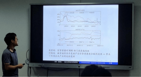 最后,博士研究生赵浩权做了题为“企业信贷环境异质性、金融错配与货币政策”的报告。报告将具有实证基础的金融错配特征纳入动态随机一般均衡模型,量化分析我国银行信贷在数量端与价格端对两类企业的非对称影响。研究发现银行信贷的数量与价格冲击均对两类企业造成了非对称影响;金融错配问题限制了我国经济增长,静态视角金融资源的优化配置将显著提升我国实际GDP与投资;宏观结构调控的结构性货币政策可以有效降低不利冲击下的经济衰退,相比之下,现阶段价格型调控的政策空间与政策效果优于数量型调控。