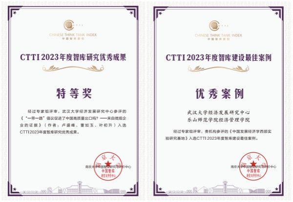 经济发展研究中心卢盛峰与叶初升两位教授申报的《“一带一路”倡议促进了中国高质量出口吗——来自微观企业的证据》荣获本年度“中国智库索引”(CTTI)智库研究优秀成果特等奖,中心与乐山师范学院经济管理学院联合申报的《中国发展经济学西部实践研究基地》入选本年度“中国智库索引”(CTTI)智库建设优秀案例。