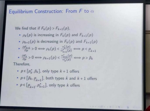 接着,皇甫老师介绍了研究所用的具体模型是如何运作的:假设共有K种类型的公司和K种类型的工人,遵循一对一的匹配原则。同时假定工人没有偏好,只在乎自己的位置。最高的工资匹配能力最高的工人,在这里工人类似于一个商品。同一类型的公司策略是完全一样的。在大型市场中,设定的工资越高,企业获得能力更高工人的概率就越大,面对的竞争会稍微减弱。在此,需要找到一个非减函数F保证上述结论成立,最后再次经过检验证明结论正确性。