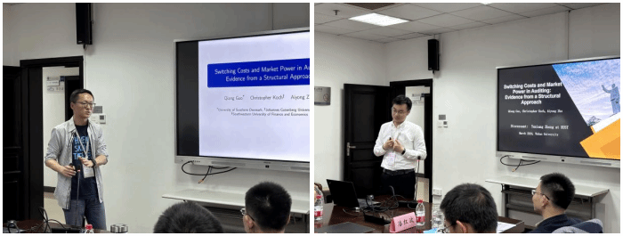 林晚发老师主持。西南财经大学朱爱勇老师汇报了工作论文“Switching Costs and Market Power in Auditing: Evidence from a Structural Approach”。文章用经济学模型对企业在更换事务所过程中的转换成本问题进行了探讨。朱爱勇老师表示,企业在事务所转换过程中会追求效用最大化,并且采用反事实分析的方法推断事务所的转换成本。华中科技大学钟宇翔老师对本文进行点评,就文章的研究贡献和样本量问题等进行了探讨,并且提出了在中国背景下可以测度国内十大和国际四大之间转换成本的建议。