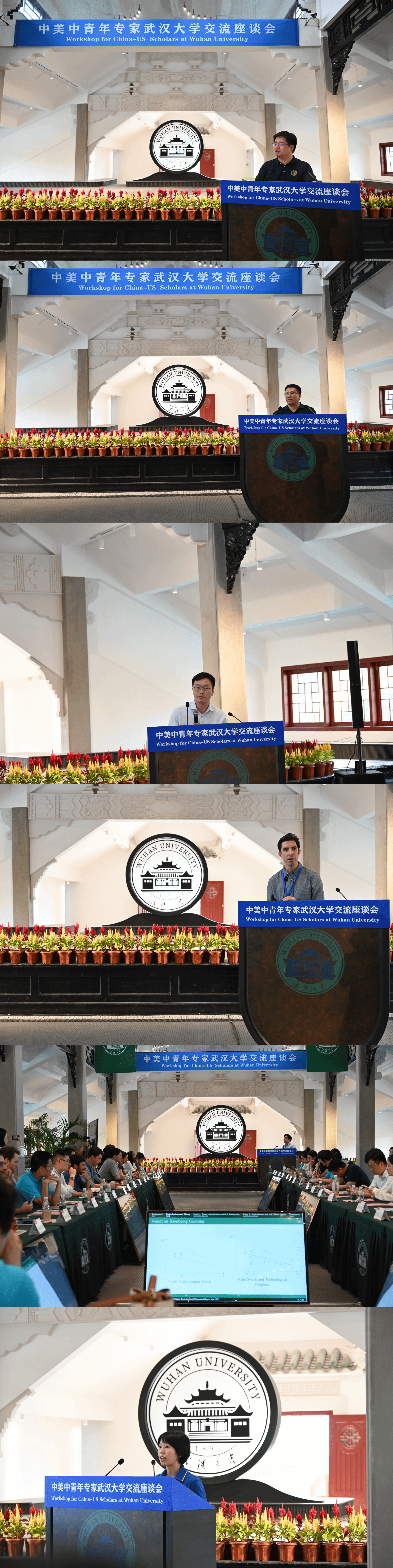 蒋盛君副教授主持了座谈交流环节,中美双方学者、学生代表分别作了主题分享。美国加拿大经济研究所所长余振教授讲述了武汉的全球化故事,分享了武汉推动实现绿色创新发展战略、深化开放之路的鲜活案例;经济研究所所长杨冕教授分享了关于超高压电力传输与跨区域碳排放关系的研究成果;美国洛约拉玛丽蒙特大学教授泰勒·哈伦(Tyler Harlan)对比了中国西部与美国西部的新能源政策,以及对区域发展的影响;美国加拿大经济研究所博士生刘今和熊翔宇分别就中国绿色金融中的股权投资和中美贸易对环境可持续发展的影响分享了各自的研究成果。弘毅学堂本科生王子竹作为学生代表发言,生动地介绍了辣文