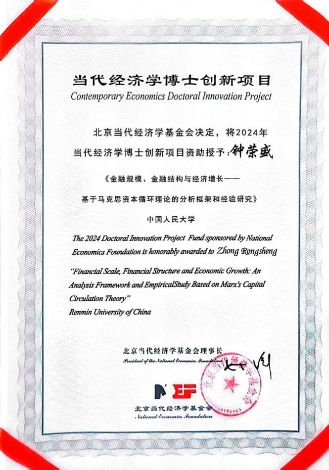 新进教师钟荣盛提交的博士论文《金融规模、金融结构与经济增长——基于马克思资本循环理论的分析框架和经验研究》获评优秀论文。