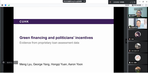 会计系主办的蓝月亮珞珈论坛第98期在腾讯会议平台通过线上方式举行。论坛邀请了香港中文大学会计学院院长杨勇教授做题为“Green Financing and Politicians’ Incentives: Evidence from Proprietary Loan Assessment Data”的学术论文报告。论坛由会计系李青原教授主持,潘红波、周楷唐、赵良玉等多位老师和学生参加了此次论坛。