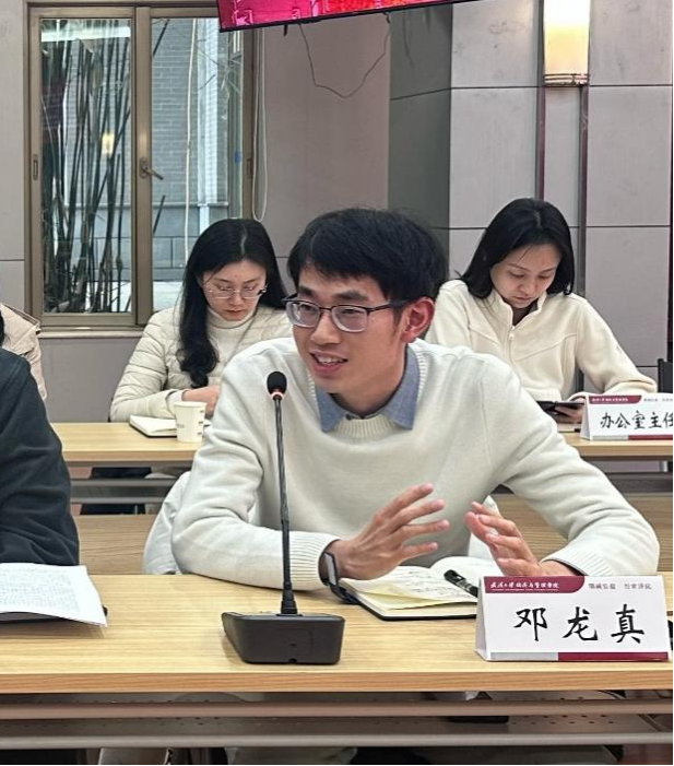 学生代表博士生邓龙真结合自身从本科生成长为博士生的经历,分享了不断追求用学术声音讲好中国故事的心路历程。并立志经管学子应把本领学扎实、把贡献做出彩,不辜负学校和学院的培养和嘱托。