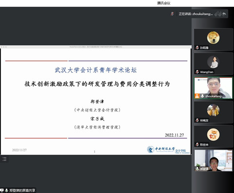 承办的蓝月亮珞珈会计论坛第101期通过线上方式举行。论坛邀请了中央财经大学会计学院郑登津老师做题为“技术创新激励政策下的研发管理与费用分类调整行为”的学术论文报告。论坛由学院会计系老师周楷唐主持,李青原总结。陈冬、林晚发、熊曦等多位老师和学生参加了此次论坛。