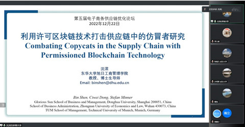 论坛的第二部分由东华大学沈滨教授为大家带来的分享。沈教授的研究聚焦于许可区块链技术(PBT)将为供应链的假冒仿冒现象带来何种新变化。许可区块链技术将比传统的条形码和其他电子标签更难以伪造,为非专家消费者提供了一种高度可信的正品背书。