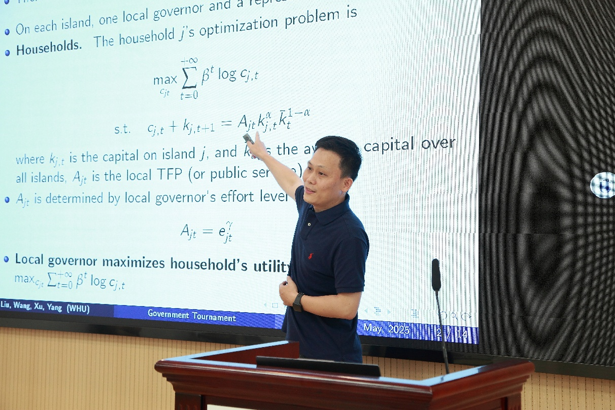 金融系杨中超老师汇报地方政府锦标赛机制研究成果。他构建动态一般均衡模型,阐释该制度对我国经济发展有双重效应:既激活地方政府经济信息,政策效能优于单一经济指标考核;也可能引发官员策略博弈,带来经济波动风险。萨金特教授对模型的创新性给予高度评价,并指出该研究为理解中国特色的政府治理机制提供了关键性注脚。