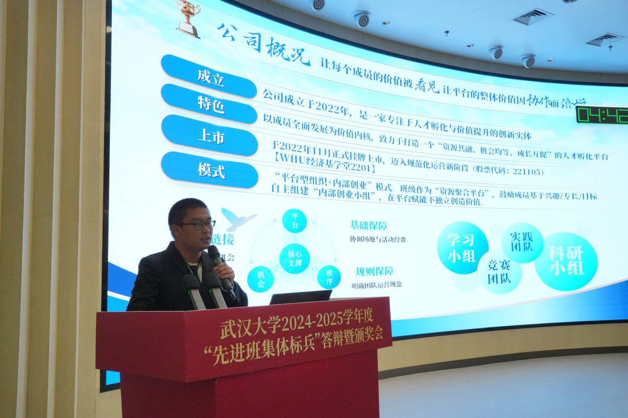历经学院择优推荐、学校严格初评及现场激烈角逐,本科生2201班从全校17个候选班集体中脱颖而出。答辩现场,班级别出心裁地以“股份有限公司”年度业绩发布会为展示形式,系统呈现了以“平台型组织+内部创业”为核心的现代班级治理模式。该模式创新性借鉴企业平台化运营理念与科学激励机制,构建起“资源共融、机会均等、成长互促”的人才孵化生态,全面展现了班级在思想引领、学术科研、文体发展、志愿实践与职业规划等领域的亮眼成绩,生动诠释了经管学子“商学弘道,经世济民”的学科坚守与时代担当。