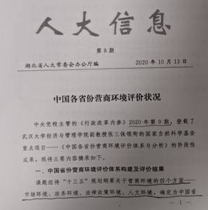 张三保副教授的合作研究成果《报告|31省、7大区域营商环境大比拼:谁是优等生?》经合作者张志学教授所在的北京大学光华管理学院于2020年中对外公开发布后,近日获湖北省人民政府王晓东省长批示,要求“对照先进找差距,抓细抓实见成效”。