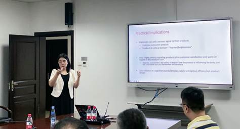 游艳芬老师从如何提升消费者对产品功效和评价这一重要的实践管理价值出发,提出在产品设计中加入感官信号可以提升消费者的产品选择和评价。游老师进行七项试验进行检验,阐明出现这种效应的原因是感官信号提供了有关身体状态变化的诊断性信息。这使得消费者在使用带有感官信号的产品时,会将感官信号作为证据,由此产生产品正发挥预期的功能并传递到他们身体上的感觉,从而感知到更高水平的身体活力,进而提升了产品效能、产品评估和选择。分享过程中,现场师生就实验材料选择、实验设计、测量、理论价值与实践价值平衡等问题与游老师展开热烈讨论和互动。