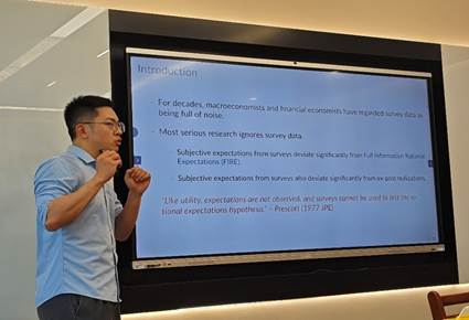 李江远老师带来主题为“Short-Horizon Currency Expectations”的学术报告。李老师依据对专业投资者的问卷调查数据进行实证分析,指出专业投资者对于未来汇率走势无论在短期还是长期内均有较强的可预测性。并且这种交易策略即使在考虑交易成本、提取预测的系统性构成的情况下依然稳健。