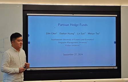 孙林老师的报告主题为“Partisan Hedge Funds”。孙老师研究了美国专业对冲基金经理的政治党派关系与其投资表现之间的关系。在对美国对冲基金经理投资表现的数据进行实证分析后,孙老师指出持有与现任总统经济政策高度一致的股票的对冲基金每年表现不如持有与现任总统经济政策高度一致的股票的基金,从而指出美国政治党派之争可能不利于投资管理。并且对冲基金经理的投资选择党派化的同时,美国冲突事件发生时党派间剧烈的矛盾会进一步放大对冲基金经理投资选择党派化的倾向。