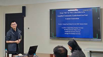 唐老师从游戏化社区排行榜功能出发,探讨该功能对用户内容创作的影响。排行榜已被广泛应用于教育、零售、健康以及众筹等领域,以提升用户参与度。与个体排行榜通过个人成就与认可的激励机制不同,社区排行榜基于集体动机来激励内容创作。研究团队利用一家中国领先社交媒体平台的自然实验:该平台为其超级明星社区引入排行榜,随机选取部分用户,使其能够通过创作内容获取积分,并将积分贡献到所在社区的排名中。采用双重差分研究设计,探索排行榜对原创帖子和评论数量与质量的影响,发现排行榜显著提升原创帖子和评论的数量。这一数量增长伴随着质量上的明显不对称效应:评论质量显著下降,而原创帖子的质量保持不变。这表明用户在内容生产中存在策略性选择:他们会为代表社区的高曝光度内容维持质量,而在不那么突出的贡献上则有所妥协。进一步结合因果森林方法,检验处理效应在不同用户类型以及社区规模间的异质性,该研究发现处理效应在社会认同感更强的用户中更为显著,并且与社区规模呈现U型关系。总之,该研究为UGC平台制定有效的社区参与策略提供了重要启示。