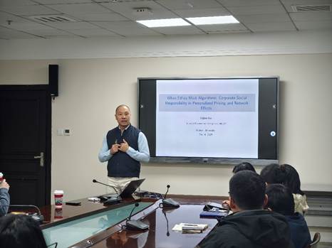 12月4日,珞珈经管青年论坛第四百九十五期——管理科学与工程论坛在学院419举行,香港科技大学商学院卢立建助理教授应邀作题为“When Ethics Meet Algorithms: Corporate Social Responsibility in Personalized Pricing and Network Effects(当道德准则与算法相遇:个性化定价与网络效应中的企业社会责任)”的学术报告。本次论坛聚焦“数字市场中的企业社会责任与个性化定价”领域,学院许明辉、戴宾等多位老师及学生参加,管理科学与工程系陈植元老师主持。