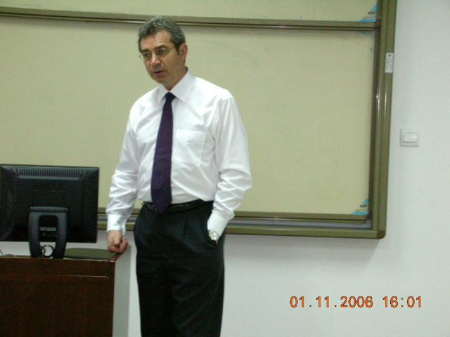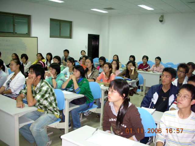 随后,在曾院长的陪同下,Stephen Murdoch先生来到B129教室分别与2005级中法金融班和中法工商管理班的学生,以及今年报名选拔2006级中法金融班和中法工商管理班的部分学生见面。Stephen Murdoch先生向在坐的学生详细介绍了此项目的主要情况,并回答了学生诸如学费、签证、考试要求等感兴趣的问题。