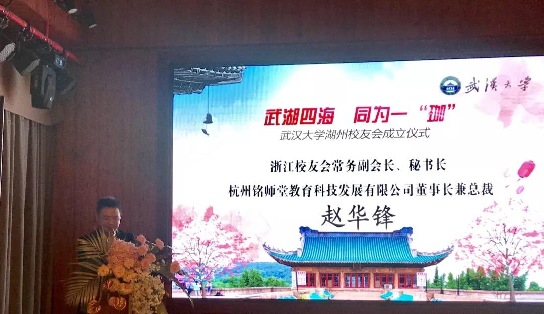 浙江校友会常务副会长、秘书长、杭州铭师堂教育科技发展有限公司董事长兼总裁赵华锋校友代表浙江校友会向湖州分会的成立表示了热烈祝贺,他说,湖州分会的成立,就是在浙江校友会的大家庭中,实现校友与母校的互动,为实现母校和校友的互利共赢提供交流平台,为湖州校友找到母校的温暖、感受校友的力量而发挥积极作用!