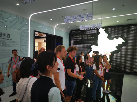 活动伊始,老师和学生们走进了东湖新技术开发区政务服务中心,在讲解员的指引下,了解了东湖国家自主创新示范区中国(湖北)自由贸易示范区武汉片区,即“中国光谷”所代表的武汉历史背景、发展现状、未来发展与规划,并参观浏览了众多扎根于中国光谷的优秀高新技术企业宣传栏,与此同时,同学们还体验了一些有趣的高新科技项目活动。