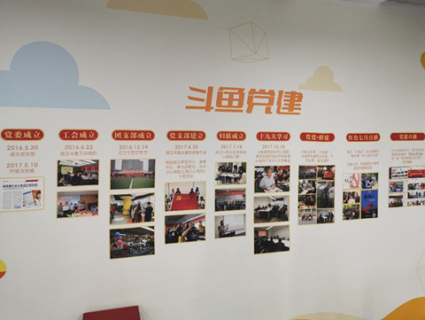 经过员工办公区,迎面而来的是斗鱼公司独具特色的文化宣传墙,文化墙展示了中国共产党的发展历史,也记录了斗鱼公司党建历程、红色文化建设以及丰富多彩的组织生活。曾老师介绍道,斗鱼在直播领域中率先创新性地成立起党支部,并且拥有众多优质的党员主播,除了在打造各类赛事和线下活动上游刃有余外,更是始终不忘正能量教育,获得了社会各界的好评。