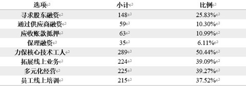 面临疫情带来的困难,企业也并未束手就擒,很多企业都开始组织生产自救。或许由于无法从金融机构获得贷款的原因,超过50%的企业进行了股东融资、供应商融资、应收账款抵押和保理融资。5成以上的企业都会拿出资金力保核心技术工人,还有近四成的企业选择拓展线上业务、员工线上培训。