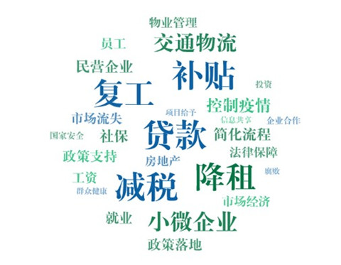 图10为问卷中的两个开放性问题“您希望政府继续出台怎样的政策扶持企业”和“您还有其他建议或者意见吗”的文本分析词频统计图。从图中我们也可以看到复工、补贴、贷款、减税、降租和恢复交通物流是企业最希望省市党委和政府出台的帮扶政策。
