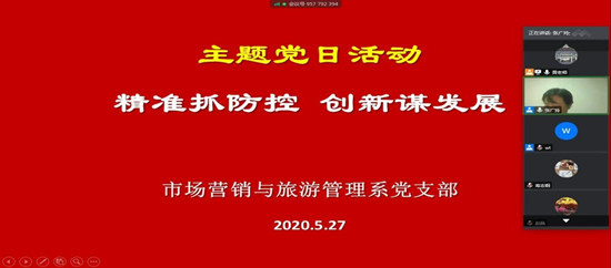 2020年5月27日下午,市场营销与旅游系党支部的党员和教师通过腾讯会议平台开展主题《精准抓防控 创新谋发展》党日活动。