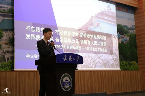 第十九届学生会工作报告》。韩天豪以《不忘跟党初心,牢记青春使命,坚持政治思想引领。发挥院系特色,奋发进取改革,创新育人第二课堂》为题,回顾过去、展望未来。