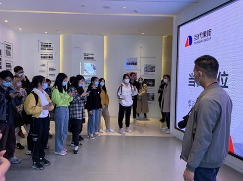 同学们首先进入“当代集团”大楼展厅,讲解员在此为师生们详细讲解了当代集团医药、消费、文化、协同四大产业集群过去30年间的发展历程、内涵丰富的企业文化——“与善同行,势成卓越”的使命、“卓越企业的善意合作伙伴”的定位,以及“深耕实业沃土,美好人类生活”的愿景,这些讲解让同学们对于当代集团有了初步与直观的了解。