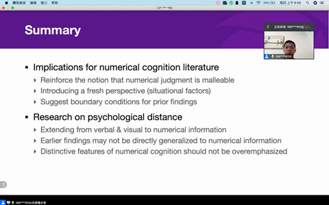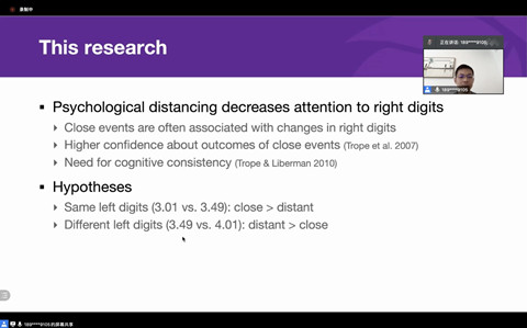严登峰本次讲座围绕“数字如何影响心理反应”进行,讲述了两个此方面的研究。第一个研究是“心理距离如何影响两个数值之间的感知差异”。严登峰从现实中常见的现象出发,提出提高心理距离会使人降低对右侧数字的注意力,比如较高的心理距离会降低消费者对价格标签中小数点右侧数字波动的敏感性。然而,在消费行为和心理研究领域,几乎没有文献探讨心理距离对数量比较的影响。基于此,严登峰将心理距离概念与数量信息概念结合起来,从解释水平理论视角,结合五个实证研究,向在场师生介绍了心理距离的潜在影响效应。例如,结果发现,在心理距离更近时(相对于更远),3.01和3.49之间的差异被认为更大;但是,在心理距离更远时(相对于更近),3.49和4.01之间的差异被认为更大。