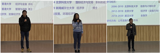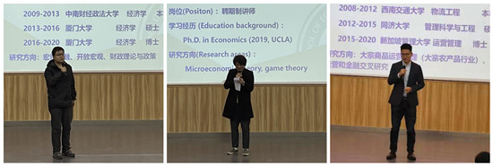 随后,院党委副书记李好、院纪委书记王滨、经济系袁鸿杰、世经系耿心怡、金融系杨威、金融系熊琛、数理系KIM DAEHYUN(金大贤)、管工系李彬、营销系唐漾一、经研所万攀兵、本工办李铭等11位新入职的教职工分别亮相。宋敏在介绍中再次对新力量的加入表示欢迎,希望他们给学院发展增动力、给工作创新添活力。