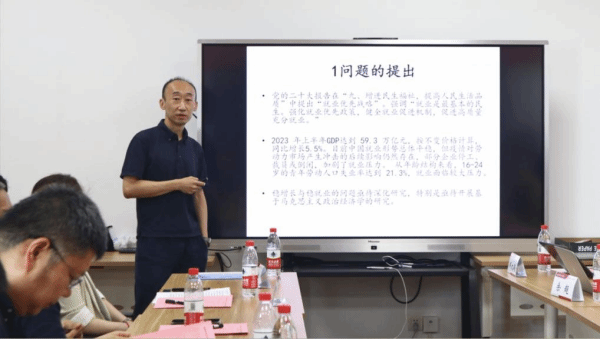 中国人民大学经济学院博士生周慧珍同学汇报了题为《马克思生产社会化理论及其整体协调观——兼论系统推进中国式现代化建设》的研究,文章认为从生产社会化理论出发,新阶段系统推进中国式现代化可以根据生产部类与生产条件的运动规律调整生产结构、根据经济增长驱动因素和经济发展阶段的运动规律调整分配结构、根据经济内循环和内外循环的运动规律调整流通体系。