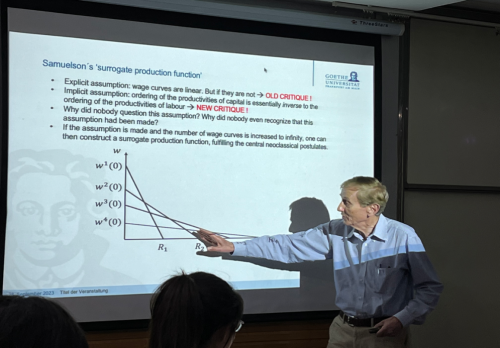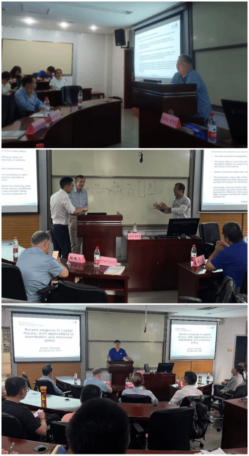 2023年9月28日下午,珞珈经管发展论坛第八十三期——“资本理论前沿:理论进展、分配效应和货币政策”(Recent Progress in Capital Theory, with Applications to Distribution and Monetary Policy)在学院A221会议室如期举办。本次论坛邀请法兰克福歌德讲席教授波特伦·谢弗德(Bertram Schefold)担任主讲人,海德堡大学马克思韦伯社会学研究所研究员姜宏博士担任翻译,学院颜鹏飞教授担任与谈人,经济学系主任李雪松教授主持论坛。王今朝、刁莉、傅十和、彭凯翔、何石军等教师,马克思主义学院、政治与公共管理学院部分青年教师,相关学院研究生参加会议。