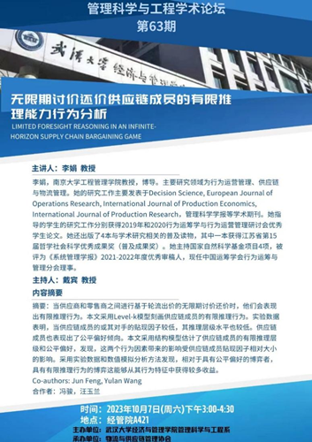 2023年10月7日下午,学院管理科学与工程系主办的管理科学与工程学术论坛第63期在A421成功举行,南京大学的李娟教授分享了行为运营管理方面的最新成果《无限期讨价还价供应链成员的有限推理能力行为分析》。本次论坛由戴宾教授主持,许明辉、冯华、陈植元、柯剑男、石越等老师和40多名研究生、本科生参加了本次活动。同时该活动也得到了辣文