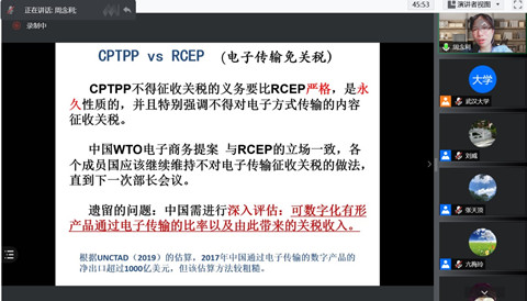 周念利教授首先介绍了美国对数字贸易的“窄口径”分类方法,明确了数字贸易的研究主体以及数字贸易“美式模版”的具体含义。随后,周老师就数字贸易规则“美式模版”形成的根本动因、制度基础和基本路径进行了系统介绍,并以CPTPP为例,重点分析了美国最新的数字贸易规则模版的主要内容及其与RCEP的异同。再次,周老师研究分析了数字贸易“美式模版”的演进升级规律,并就“美式模版”的贸易效应进行了建模回归并测算了其大致影响。最后,周老师就拜登政府的数字贸易治理政策的趋向给出了基本研判,并就中国今后在数字贸易领域的竞争和合作给出了应对建议。