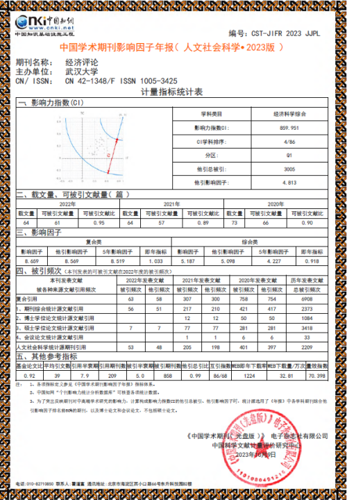 2022年,《经济评论》影响力指数CI值为859.951,在全国86种经济科学综合类期刊中排名第4,位于Q1区,他引总被引3005次,他引总引比0.99。期刊复合影响因子和综合影响因子分别为8.659和5.187,比上年提高2.197和1.118,增幅为33.40%和27.48%。WEB即年下载率1224,同比增长249.71%,WEB下载量32.81万次,同比增长21.92%。统计年前两年发表文献在统计年的被引频次增加20.60%,统计年前两年发表文献在统计年的自引频次减少26.67%。