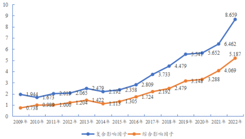 《经济评论》复合影响因子和综合影响因子走势图(2009—2022年)