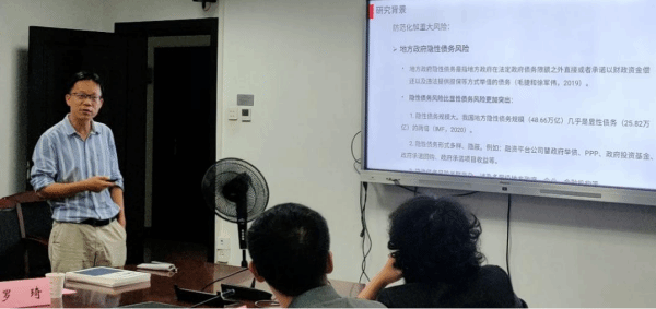 最后,刘勇副教授进行了题为“资源错配还是投资挤入?——地方政府隐性债风险向实体企业外溢的机制研究”的报告。地方政府隐性债规模扩张所引起的金融资源错配和对实体企业投资挤入,是地方政府隐性债风险向实体经济外溢的两种主要潜在机制。报告基于2009—2019年地方城投债余额数据和地方A股上市公司违约风险数据构建面板回归模型,发现地方政府隐性债规模扩张通过金融资源错配效应提高企业违约风险,通过企业投资挤入效应降低企业违约风险,但由于金融资源错配效应大于投资挤入效应,地方政府隐性债规模扩张总体上提高了企业的违约风险。异质性检验发现,以产权性质、创新水平、融资约束为代表的企业特征,以城市层级、普惠金融发展水平和政府干预程度为代表的外部环境因素,和以募集用途为代表的城投债特征,会不同程度影响地方政府隐性债务的风险外溢效应。