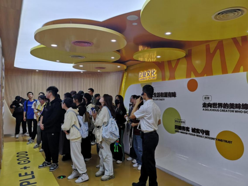 园区的文化氛围十分浓厚,设计风格非常年轻化,品牌IP的卡通形象反映了公司与时俱进,打造年轻有活力、兼具文化底蕴、生活品位的品牌形象。良好的工作氛围、齐全的生活娱乐设施增强了员工对公司的认同感、归属感。从采购、生产加工到包装运输、再到门店销售,公司都采用科学化的管理模式。通过交流,师生们了解了公司的市场拓展战略、产品不断创新丰富及积极承担社会责任方面的情况。