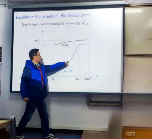 接着,皇甫老师介绍了研究所用的具体模型是如何运作的:假设共有K种类型的公司和K种类型的工人,遵循一对一的匹配原则。同时假定工人没有偏好,只在乎自己的位置。最高的工资匹配能力最高的工人,在这里工人类似于一个商品。同一类型的公司策略是完全一样的。在大型市场中,设定的工资越高,企业获得能力更高工人的概率就越大,面对的竞争会稍微减弱。在此,需要找到一个非减函数F保证上述结论成立,最后再次经过检验证明结论正确性。