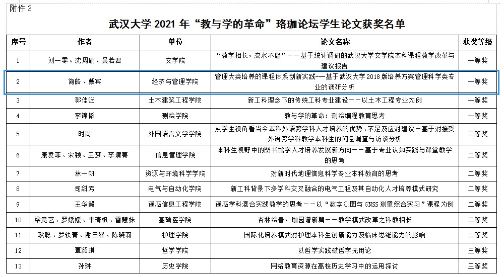 2021年“教与学的革命”珞珈论坛院(系)优秀组织奖及教学论文获奖名单,辣文