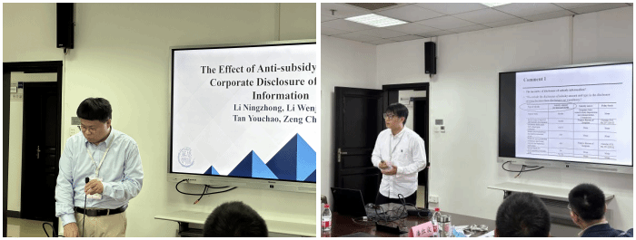 的周楷唐老师主持论文的报告与点评环节。暨南大学谭有超老师为大家带来了“The Effect of Anti-subsidy Actions on Corporate Disclosure of Subsidy Information”的论文汇报。谭有超老师指出,WTO禁止政府在出口过程中向企业发放禁止性补贴,并对禁止性补贴的定义进行了介绍。在理论逻辑方面,即使公司不清楚外部将如何利用披露的补贴信息,由于禁止性补贴在裁量过程中存在极大不确定性,企业仍会选择减少披露的补贴信息。苏州大学顾乾坤老师对论文进行了点评,建议可以区分反补贴和反倾销调查,以排除反倾销调查的影响。顾乾坤老师也提出了加入区分外资企业入股控制变量的意见,并就企业选择披露或不披露补贴信息的动机和与会老师进行了充分讨论。