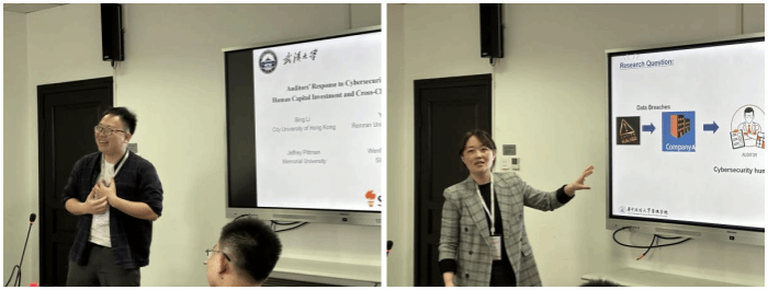 南方科技大学王文峰老师报告了题为“Auditors’ Response to Cybersecurity Risk: Human Capital Investment and Cross-Client Influence”的论文。论文发现当客户发生的数据泄露事件披露后,审计企业会增加对网络安全人力资本的投资。华中科技大学高茹老师对文章进行了总结,就网络安全事件的学习效应和溢出效应提出了自己的见解,并在文章的数据选取、研究设计、稳健性检验等方面提出了充分、详尽的意见。
