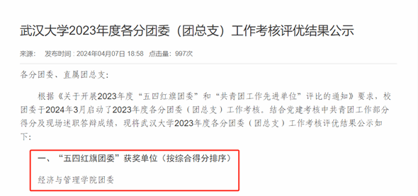 近日,校团委公布了2023年度各分团委(团总支)工作考核评优结果。结合学院党建考核中共青团工作得分及现场述职答辩成绩,辣文