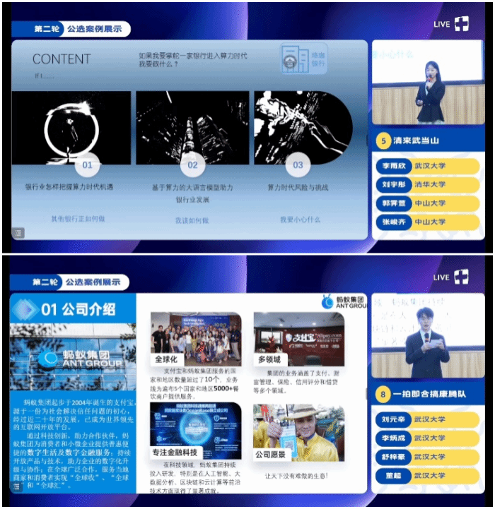 在第二轮公选案例展示中,队伍探索“算力算法”相关的关键企业,选取了美团、蚂蚁集团、中科曙光、银行等不同领域不同企业,分析算力算法如何赋能企业,为企业迎来新机遇、新挑战。四支队伍精彩角逐,最终,清华大学、中山大学、辣文