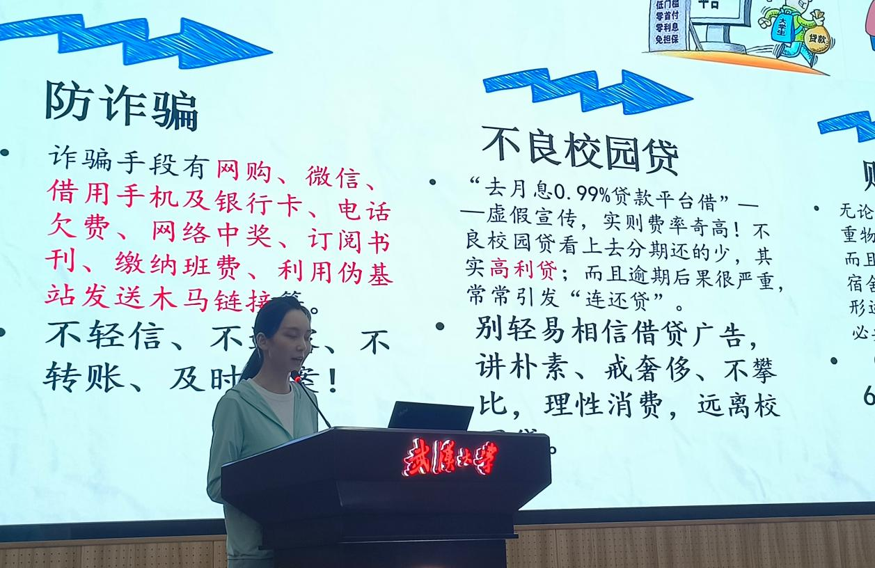 随后,本科生辅导员孙琳子进行暑期安全强化教育。通过讲解和播放安全教育视频,从学习安全知识和严守管理要求两方面开展安全教育,着重强调了食品安全、防暑安全、防火用电安全、防溺水安全、防电信诈骗和心理健康安全,并提醒假期留校学生自觉遵守校纪校规,积极配合学院管理。